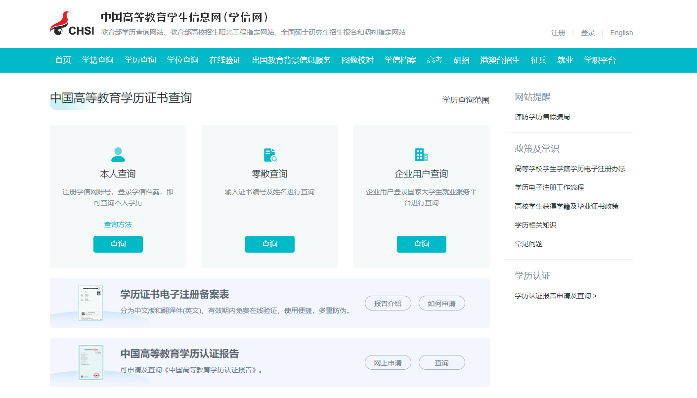 学籍查询、学历查询、学位查询、在线验证、出国教育背景信息服务、图像校对、学信档案、高考、研招、港澳台招生、征兵、就业、学职平台