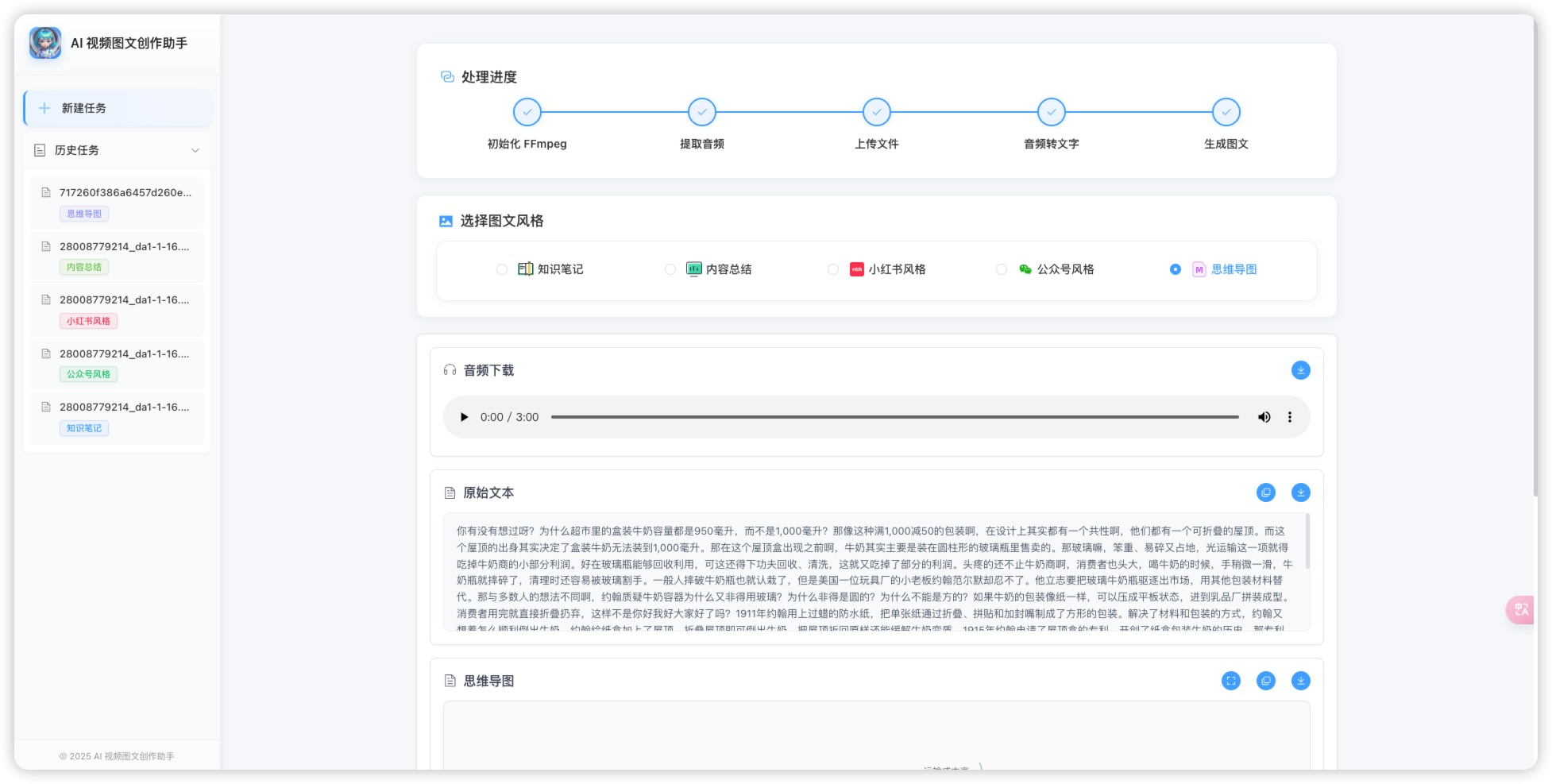 AI 图文创作助手基于AI大模型, 支持将基于任意视频/音频转换成各种风格的文档, 目前支持内容总结/小红书/知识笔记/微信公众号和思维导图